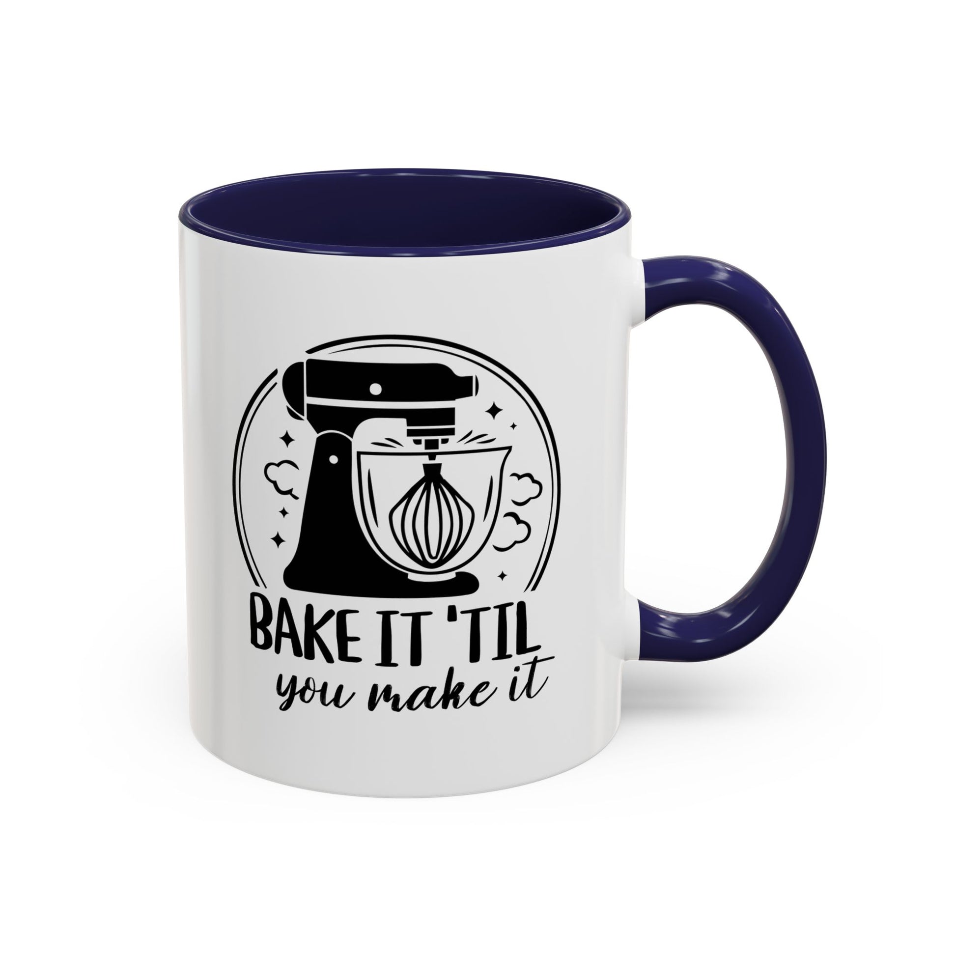 Bring a dash of humor, a spoonful of comfort, and a splash of retro kitchen charm to your daily routine with our “Bake It 'Til You Make It” mug. Designed for bakers who live for early-morning dough and late-night frosting sessions, this bright, cheery ceramic mug adds joy to any countertop. The glossy white exterior paired with a colored interior creates a playful, eye-catching contrast, while the retro-style stand mixer illustration puts your favorite phrase front and center.